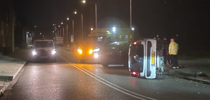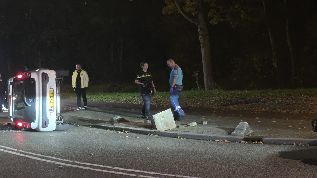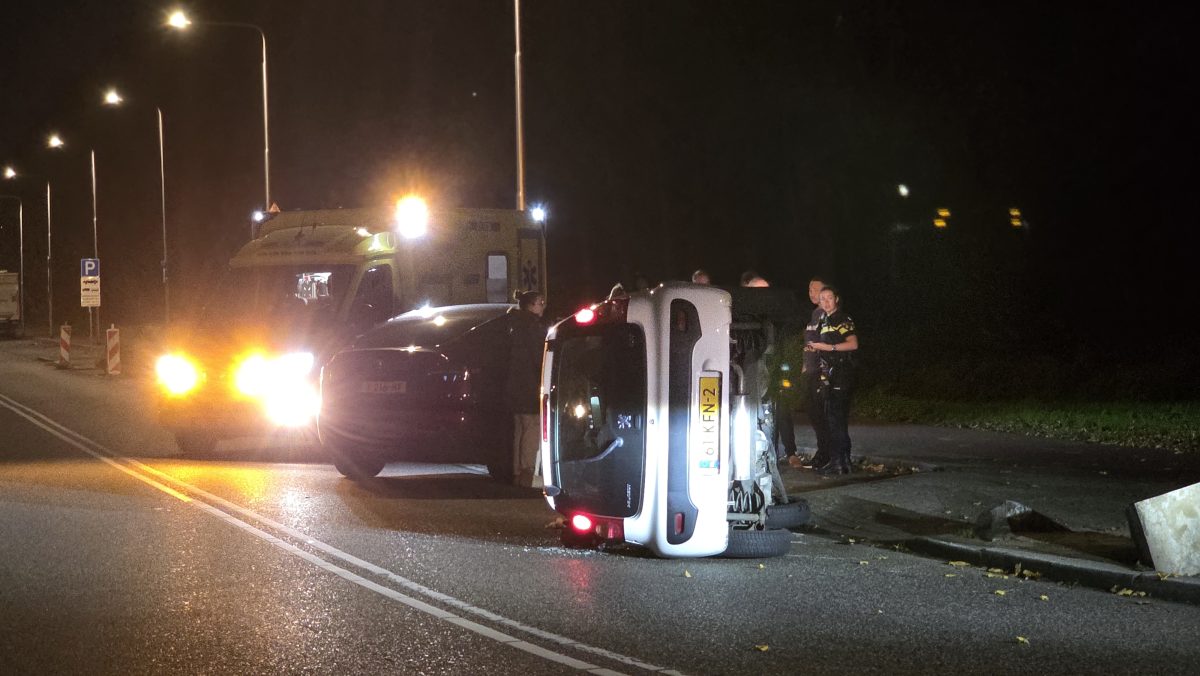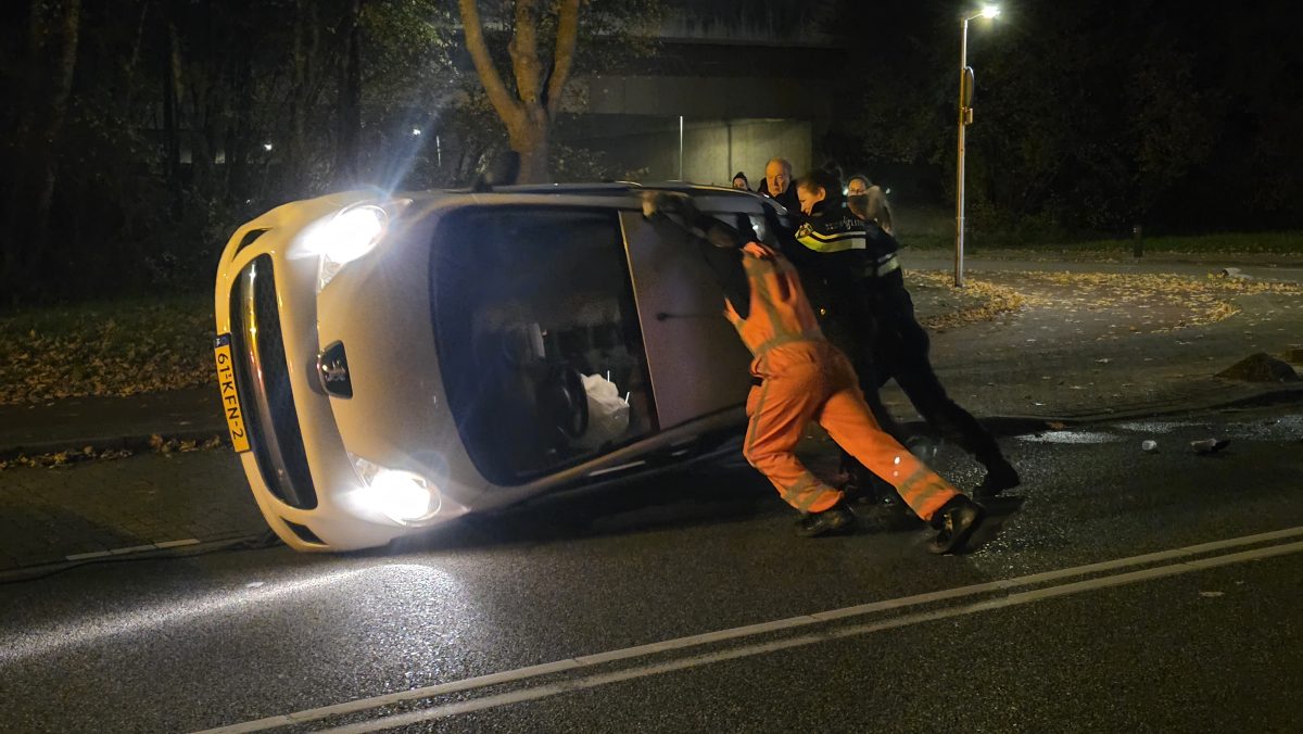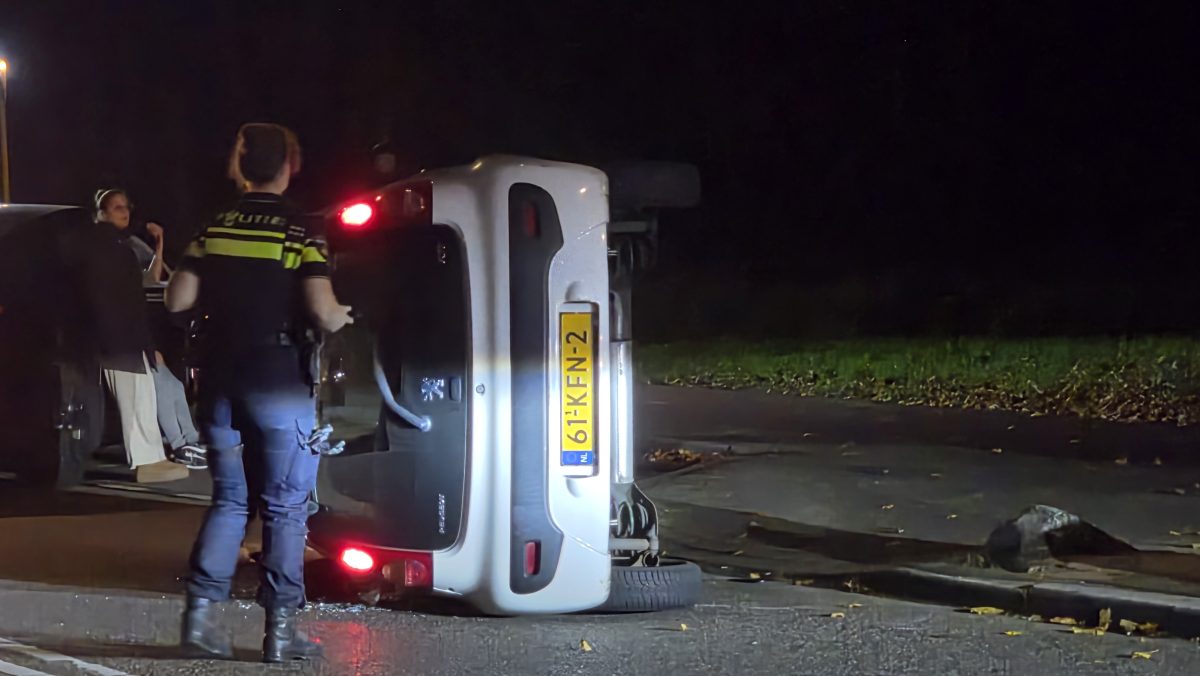 Ter plaatse bleek een automobilist tijdens het nemen van een bocht de macht over het stuur te hebben verloren, waarna het voertuig op zijn zijkant terechtkwam. De bestuurder raakte niet gewond. De bijrijder is door ambulancepersoneel gecontroleerd en mocht na een korte check weer naar huis; hij had slechts een klein snijwondje aan zijn hand door glassplinters.
