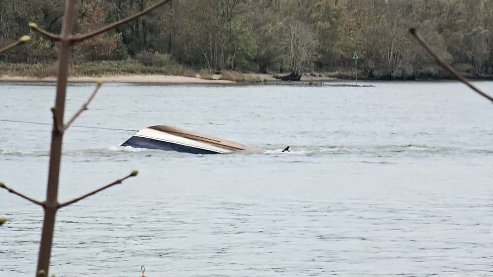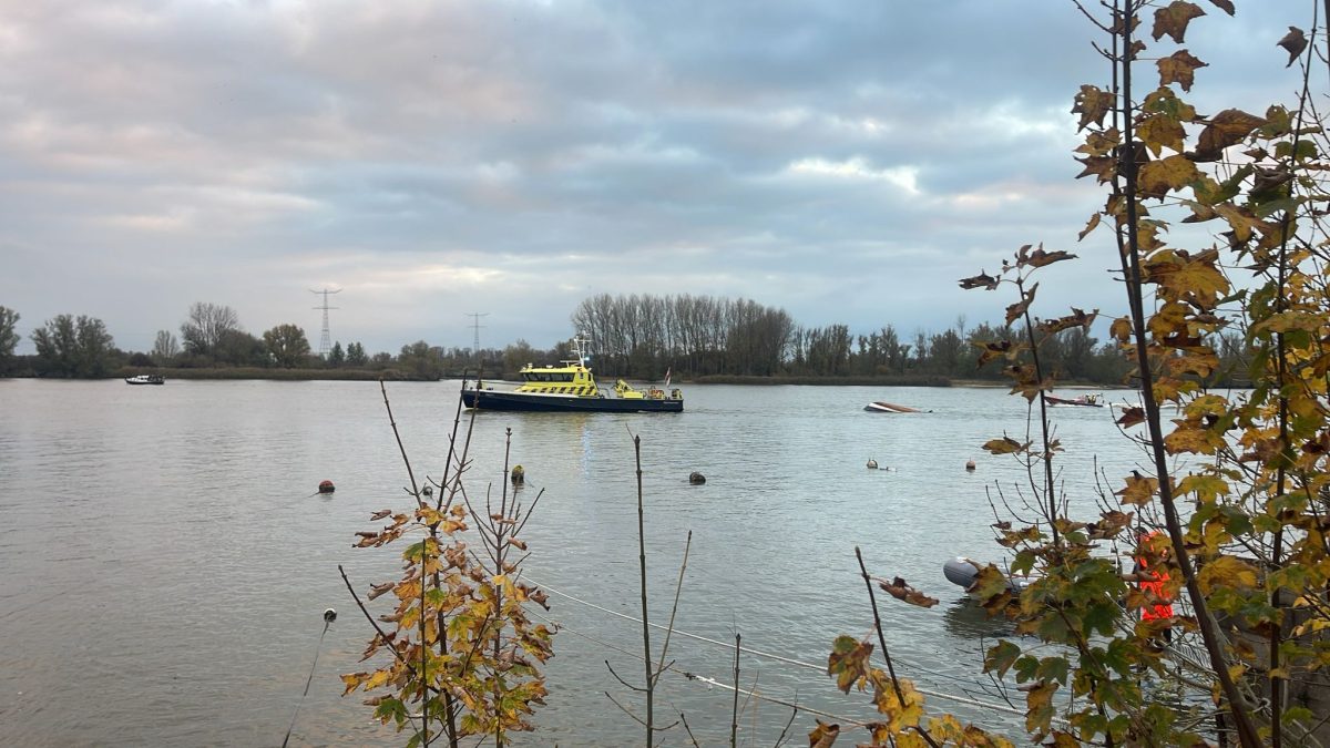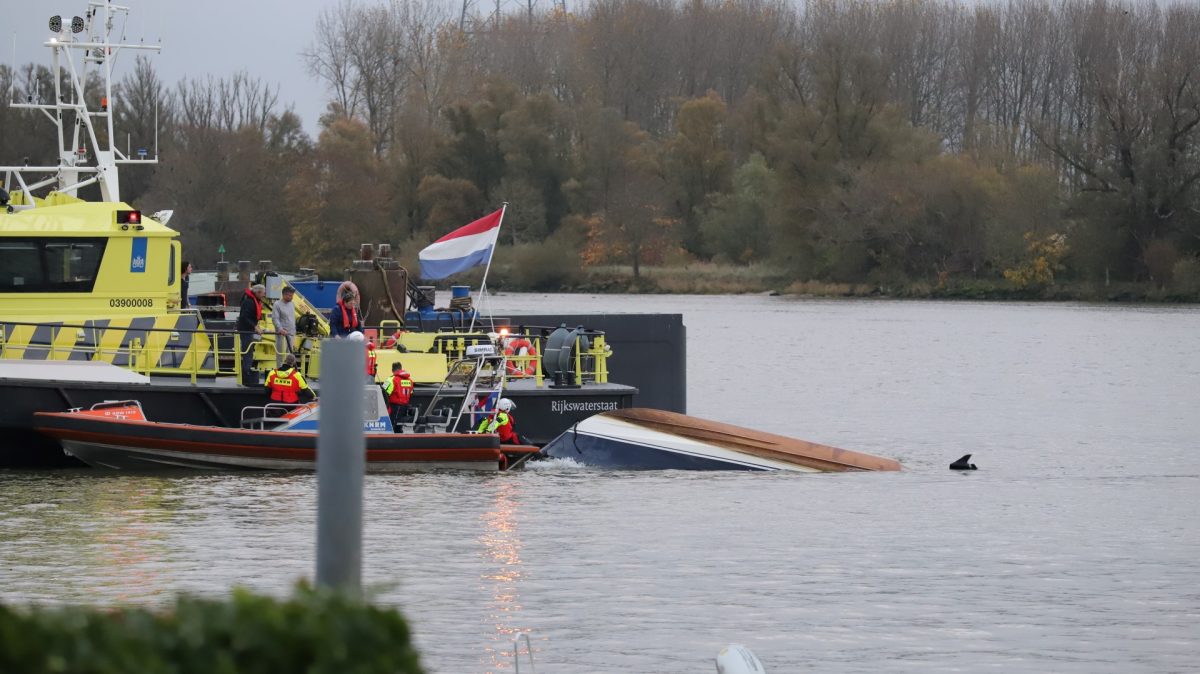 Update: Rijkswaterstaat sleept de boot op z’n kop door de rivier, om te zorgen dat hij niet naar de bodem gaat.