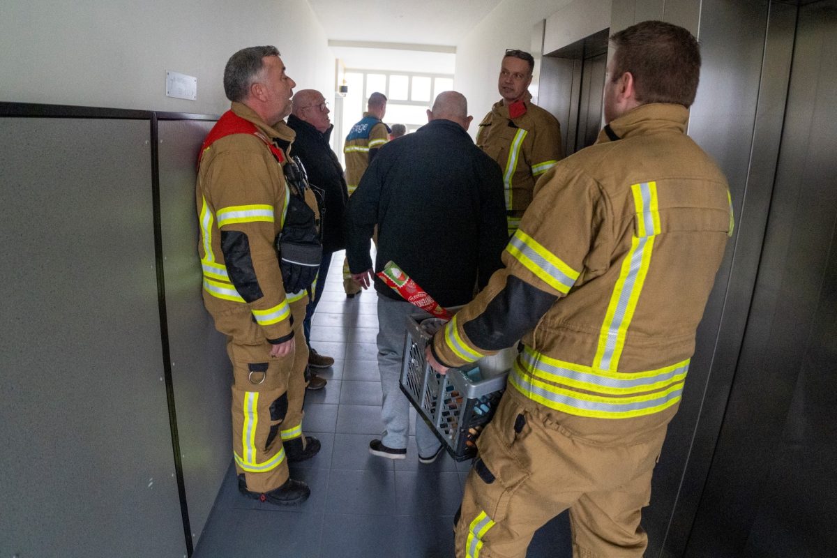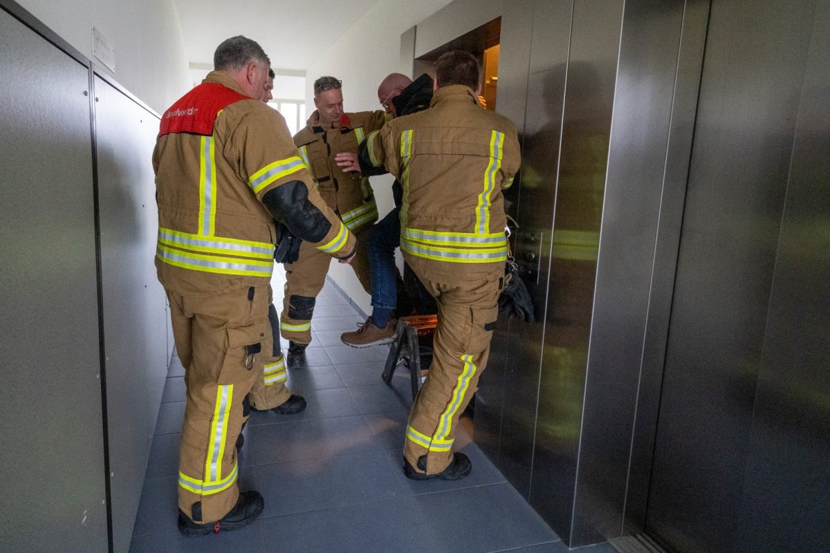 De brandweer maakte de liftdeuren voorzichtig open, plaatste een trapje en hielp de inzittenden één voor één naar buiten. De boodschappen die zij bij zich hadden, werden door de brandweerlieden naar de achtste etage gebracht, zodat de bewoners zich volledig konden richten op het traplopen.