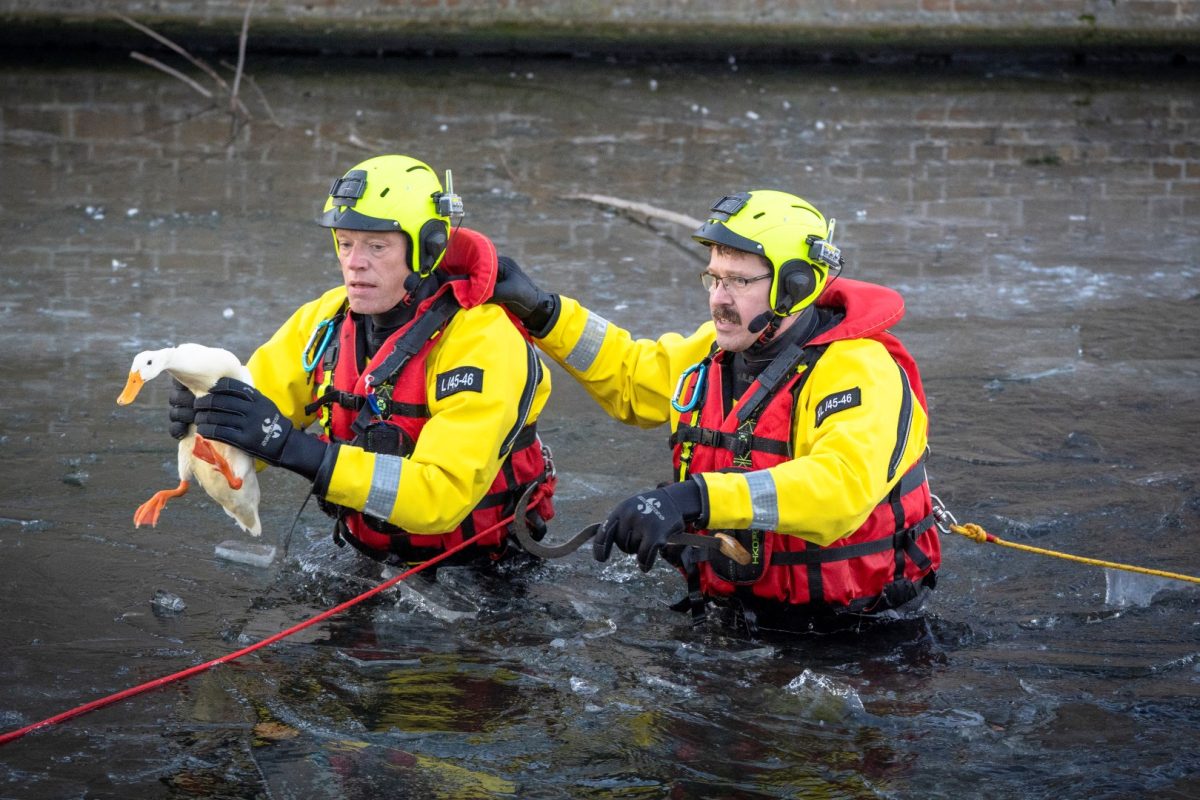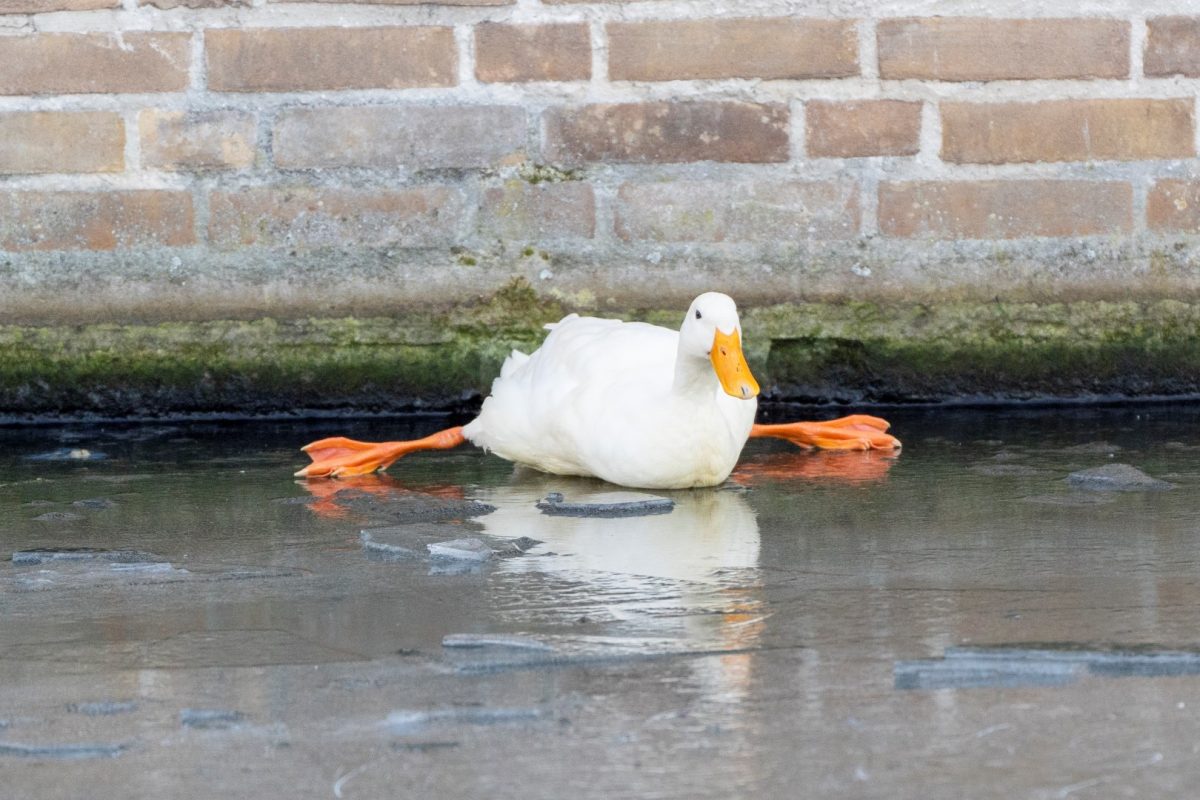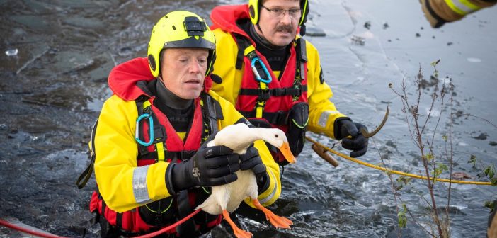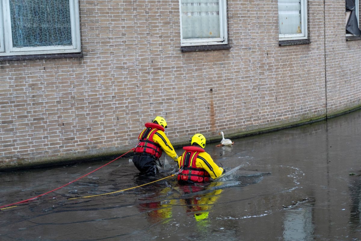 ALBLASSERDAM – Hulpdiensten zijn vrijdag 26 december 2025 in actie gekomen voor een loopeend die niet meer van het ijs kon komen bij de Fatimakerk langs de Parallelweg in Alblasserdam. Het dier kon zich niet meer normaal voortbewegen: de poten gleden voortdurend naar links en rechts weg over het gladde ijs, waardoor de eend wijdbeens bleef liggen en niet verder kwam. De dierenambulance kwam als eerste ter plaatse. Tijdens een poging om het dier te bereiken verloor een medewerkster haar evenwicht en belandde in de sloot. Zij wist zelfstandig op de kant te klimmen en heeft zich daarna in de dierenambulance opgewarmd.
