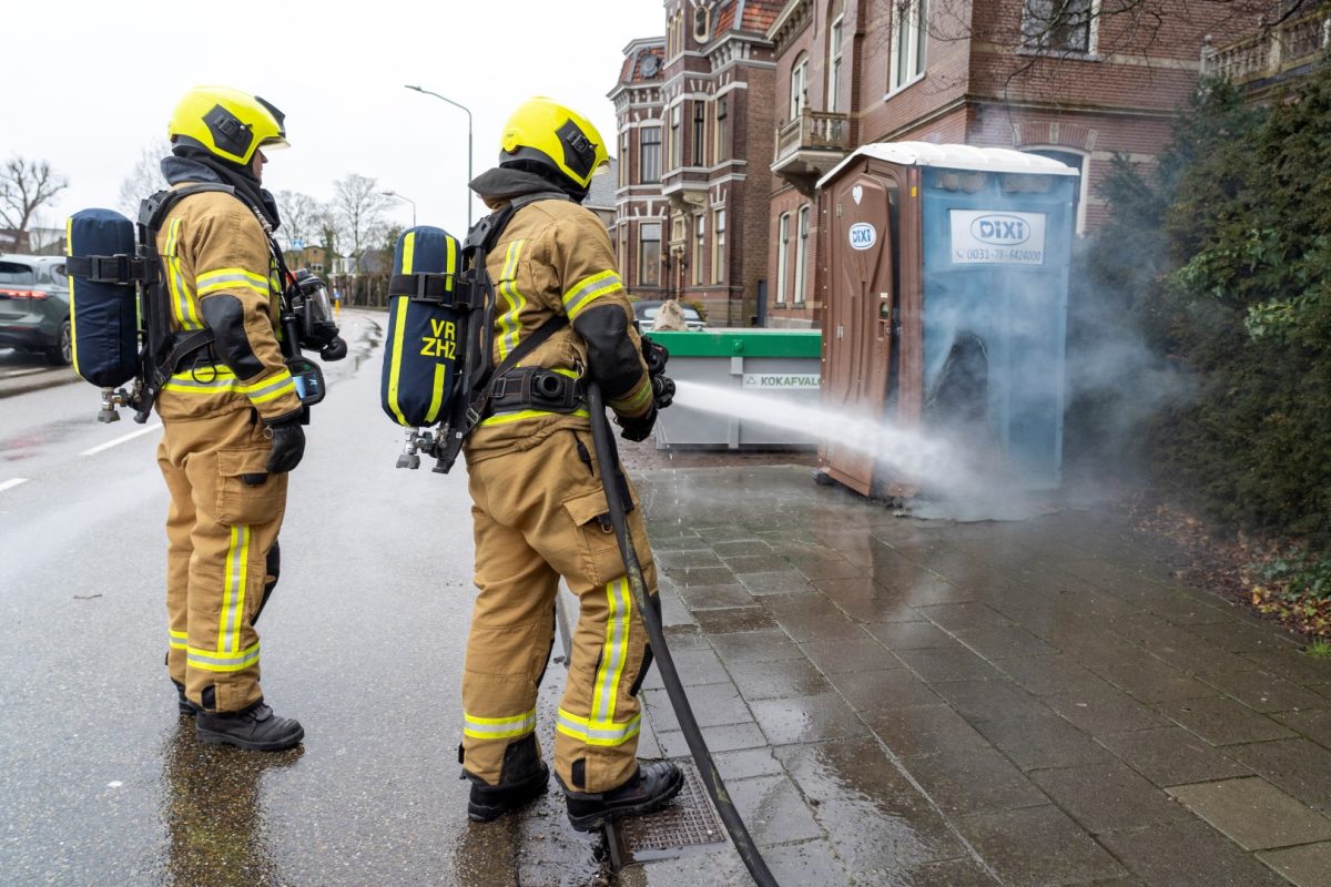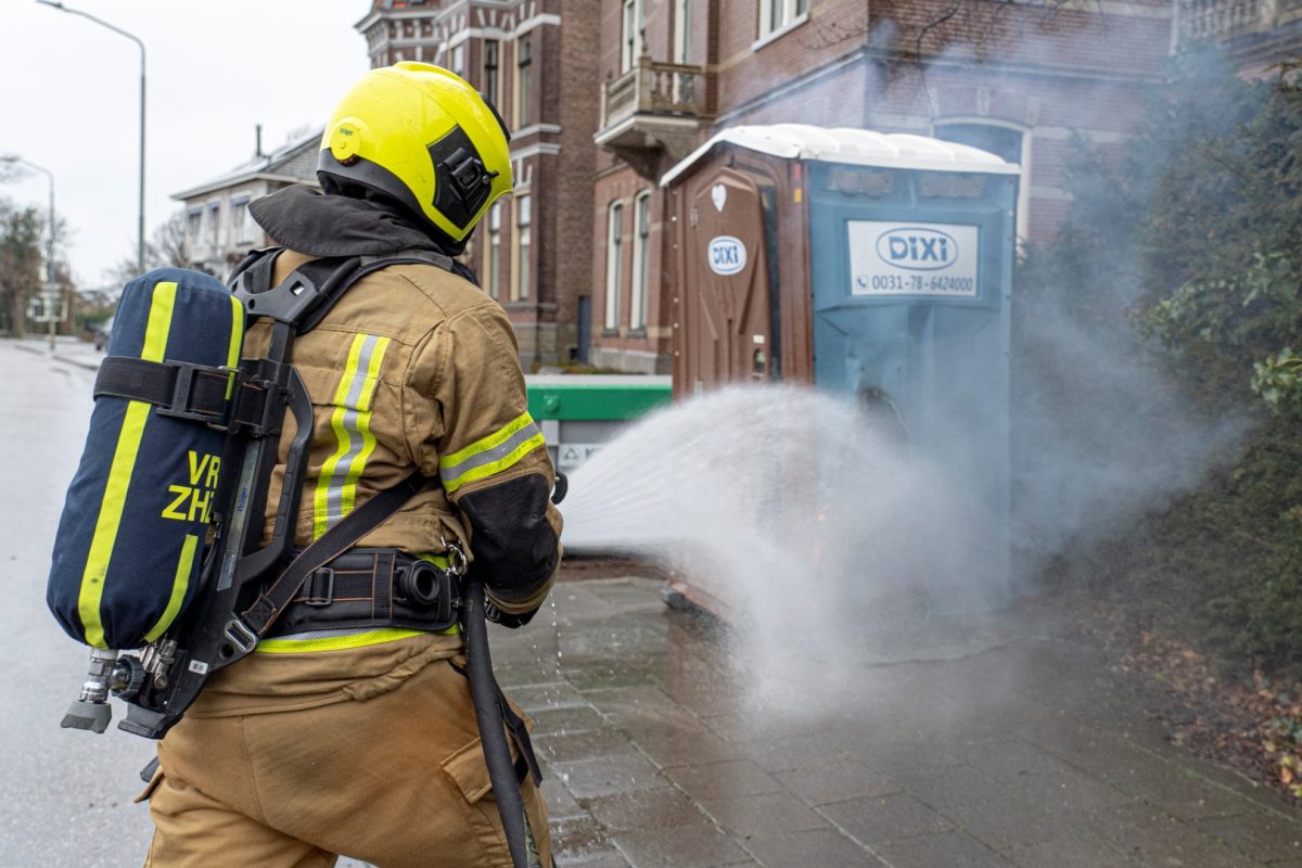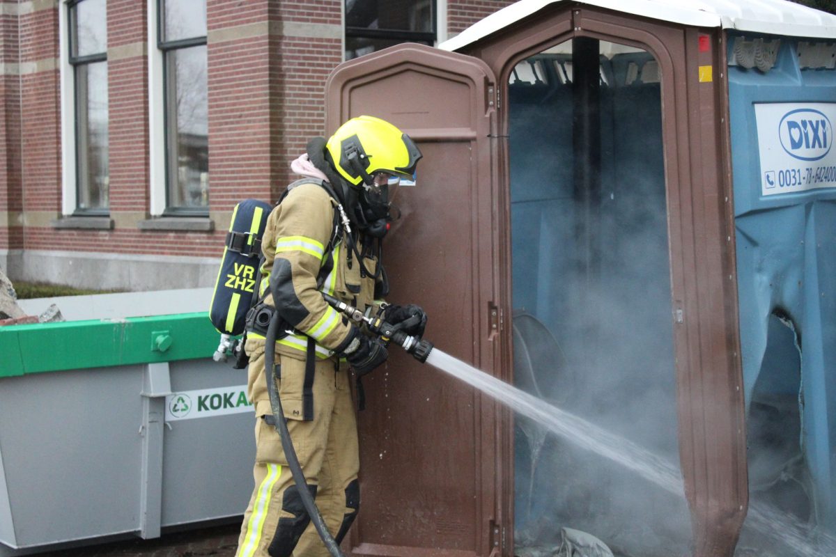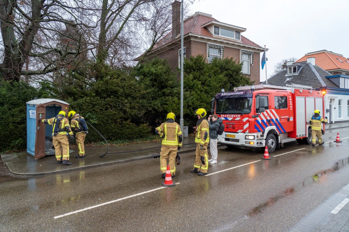 ALBLASSERDAM – Langs het Cortgene in Alblasserdam heeft zondagmiddag 22 februari 2026 een mobiel toilet in brand gestaan. Ondanks de regen, brandde het plastic hokje flink. De brandweer kwam ter plaatse en had het vuur binnen enkele minuten onder controle. Hoe het mobiele toilet is gaan branden, is niet bekend, maar brandstichting ligt voor de hand. De Dixi stond ter hoogte van werkzaamheden bij een woning langs de dijk. Foto’s: Timon Bragt en Peter Stam.