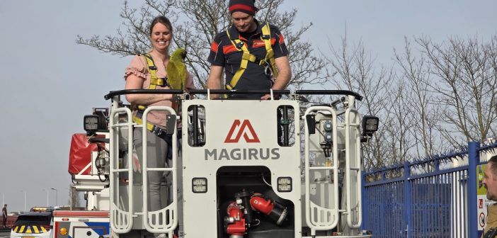 De eigenaresse ging samen met de brandweer omhoog om het dier op te halen. Nala liet zich gelukkig snel pakken en stapte zelf op de hand van de vrouw.